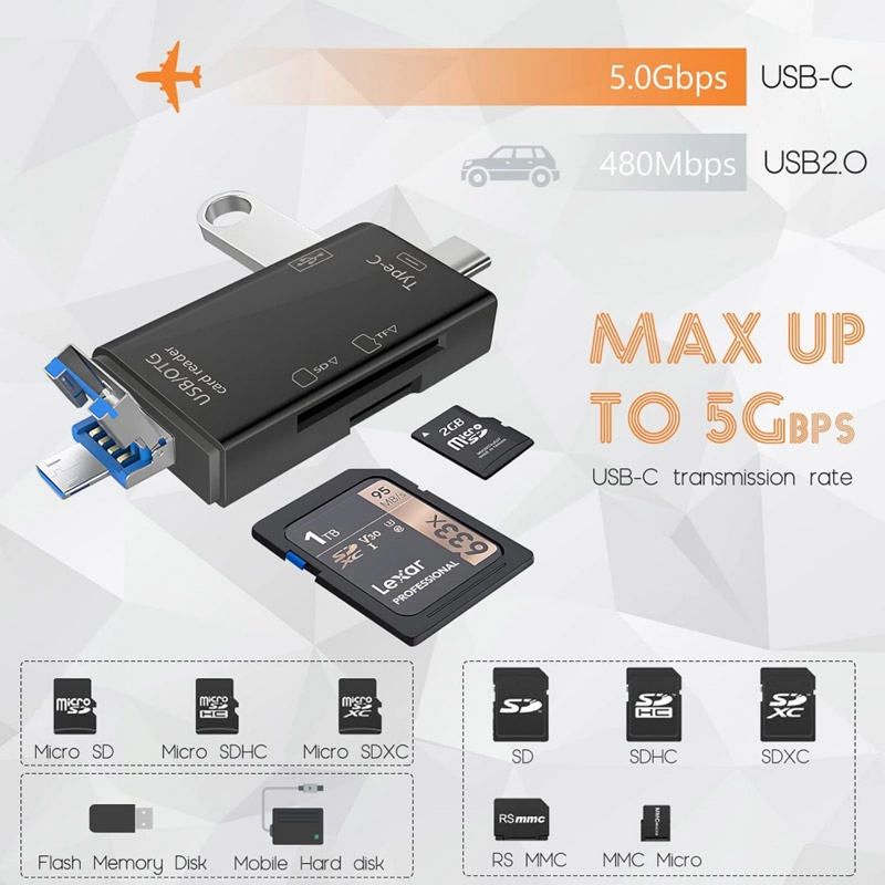 Trojna konekcija za sve uređaje: Povežite se sa bilo čim. Ovaj čitač poseduje tri različita konektora: standardni USB 2.0 za računare, Type-C za novije laptopove i telefone, kao i Micro USB za starije Android uređaje i tablete sa OTG funkcijom.